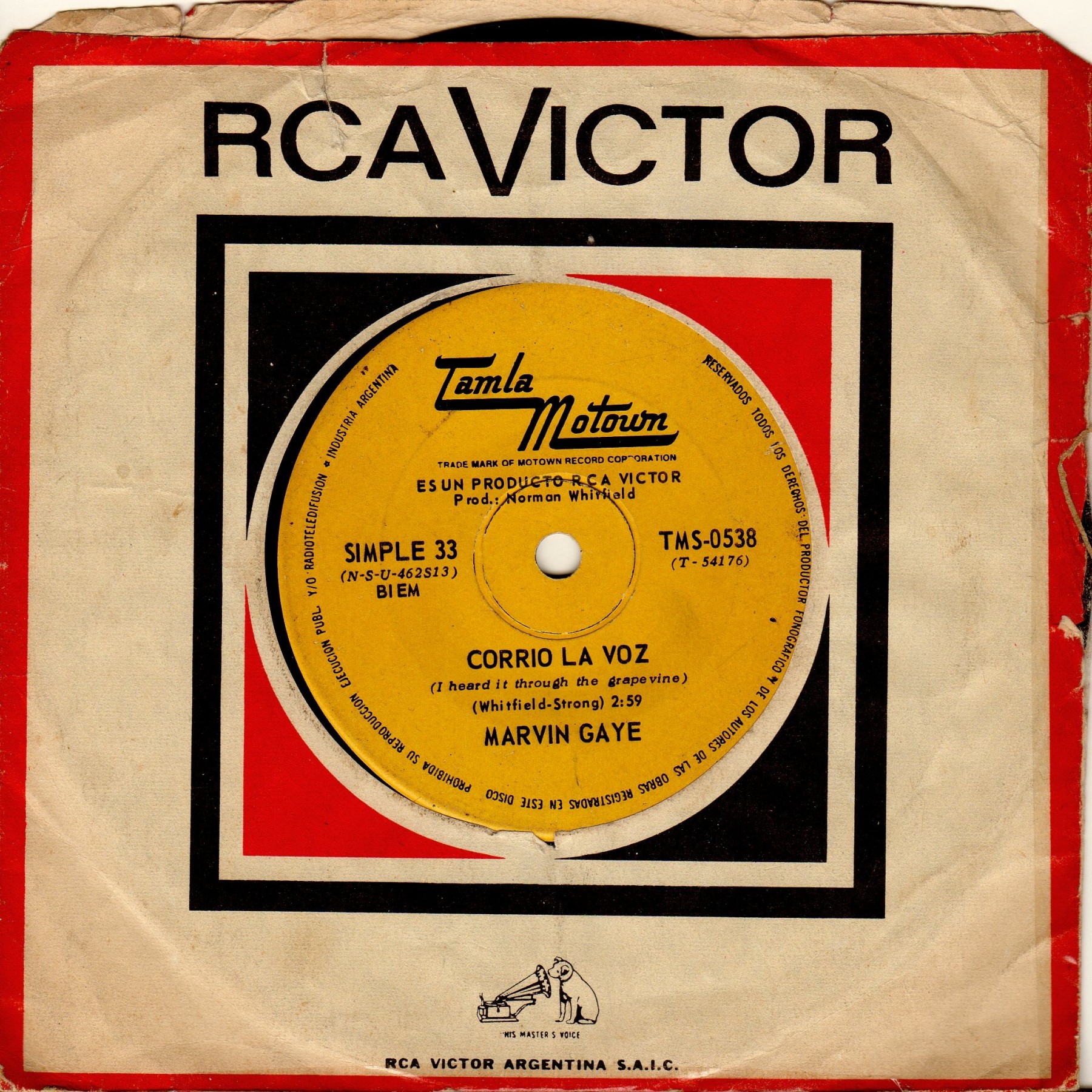 MAYBE UNIQUE? Has The Title "corrio la voz" which in Spanish translates to "spread the word" ??? Then (i heard it through the grapevine) ...Anyway Super Rare ARGENTINE Issue, Classic Motown hit, Actually A 1966 LP Track Not Released On 45 Till 68 b/w good Virtually UNKNOWN 60s Northern Dancer NOT On The UK Issue, This Came In An Argentinian RCA Sleeve So Its With It Not Sure If Thats Correct?
